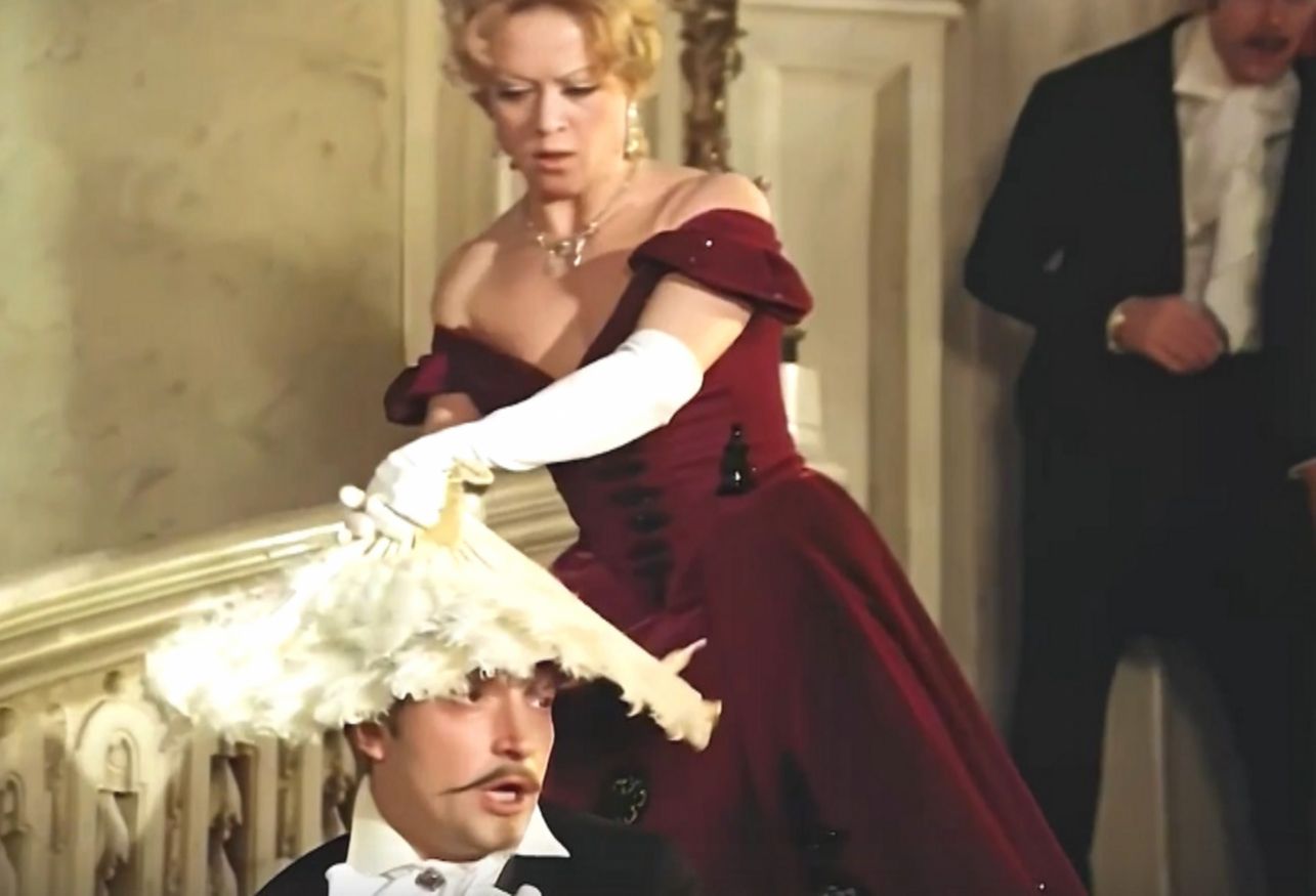 И вот тут в игру вступает Алиса Фрейндлих. С невероятной грацией она накрывает голову партнёра веером, превращая досадную случайность в настоящую жемчужину фильма.
