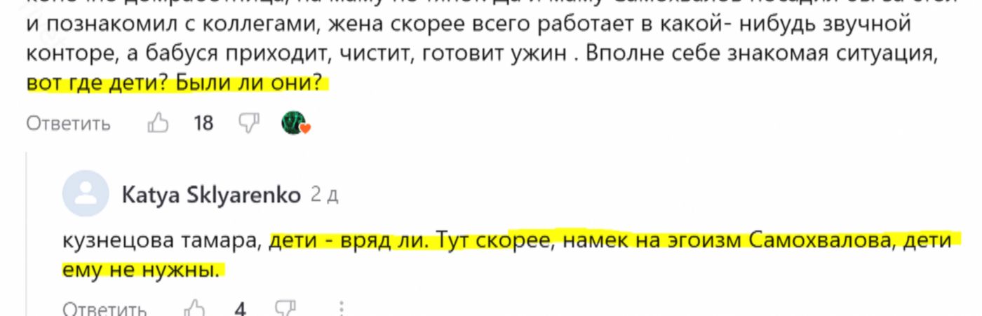 Юрий Григорьевич в своих разговорах ни разу не упоминает своих детей. Даже когда Рыжова хвастается спортивными успехами Витьки, он молчит, хотя тут само-собой напрашивается сказать что-то вроде «А мой/моя…» Но Юра молчит.