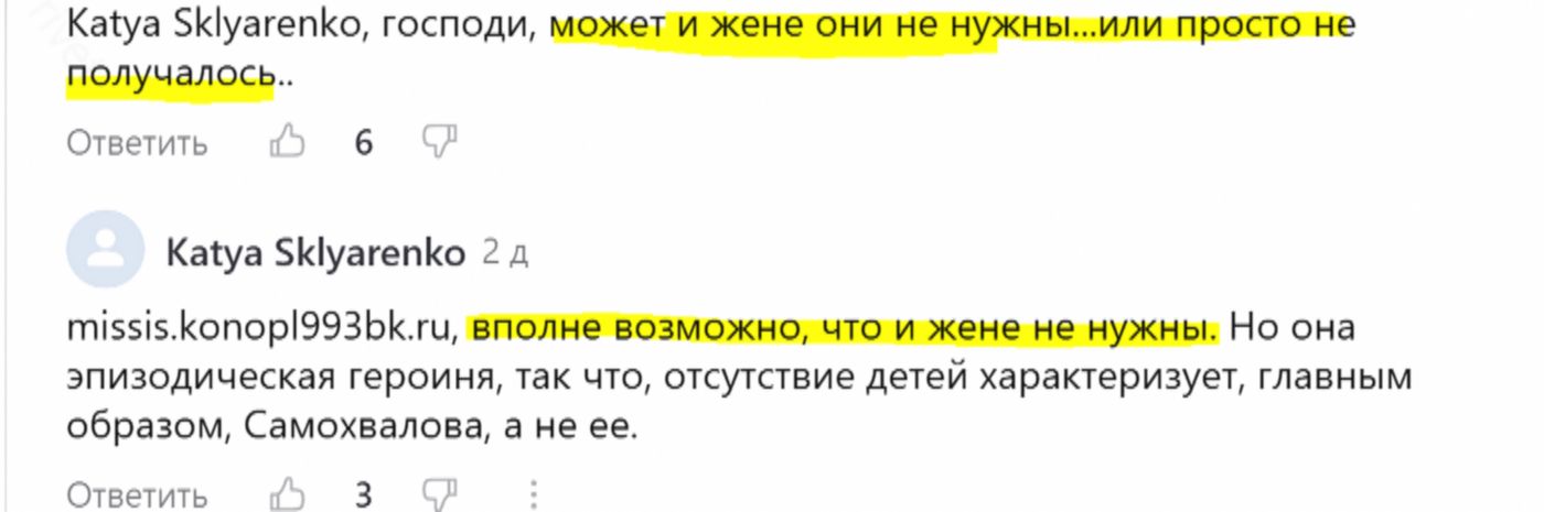 А ведь в самом деле — нам показывают молодую красивую семейную пару, показывают их квартиру, в которой глава семьи отмечает свое назначение, но ни разу в кадре не мелькнули дети. У Новосельцева дети есть — мальчик и мальчик. У Ольги Рыжовой сын-подросток. Так или иначе, но в разговорах у них мелькнет хоть раз что-то про детей. А Самохваловы?