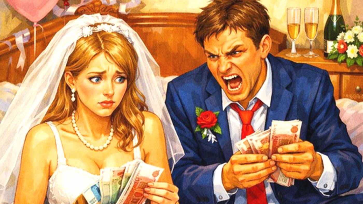 Часы на стене отеля показывали половину первого ночи. Свадьба закончилась час назад, последние гости разошлись по номерам, и молодожёны наконец остались одни в своём свадебном люксе. Настя сидела на краю кровати в белоснежном платье, которое ещё утром казалось ей облаком из сказки, а теперь просто давило на плечи. Дмитрий, расстегнув галстук, высыпал на покрывало гору конвертов.