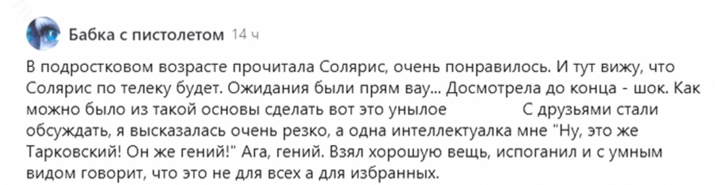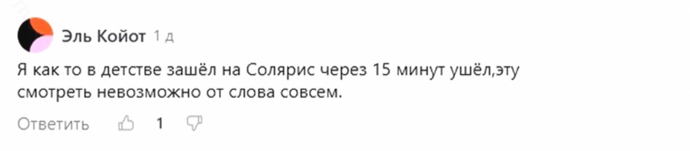 У зрителя сразу возникает масса вопросов. Как Иван сумел выбраться из плена? За что угодил в КПЗ? Что сталось с Джоном и Маргарет? Вот интрига, вот завязка! Вот стремительность событий! А в «Солярисе» мы видимо только колыхание травы и потертого мужичка с кислой миной. Интересно ли смотреть кино дальше? Только честно? Я досмотрел, ради статьи на Дзен? А обыкновенный зритель?