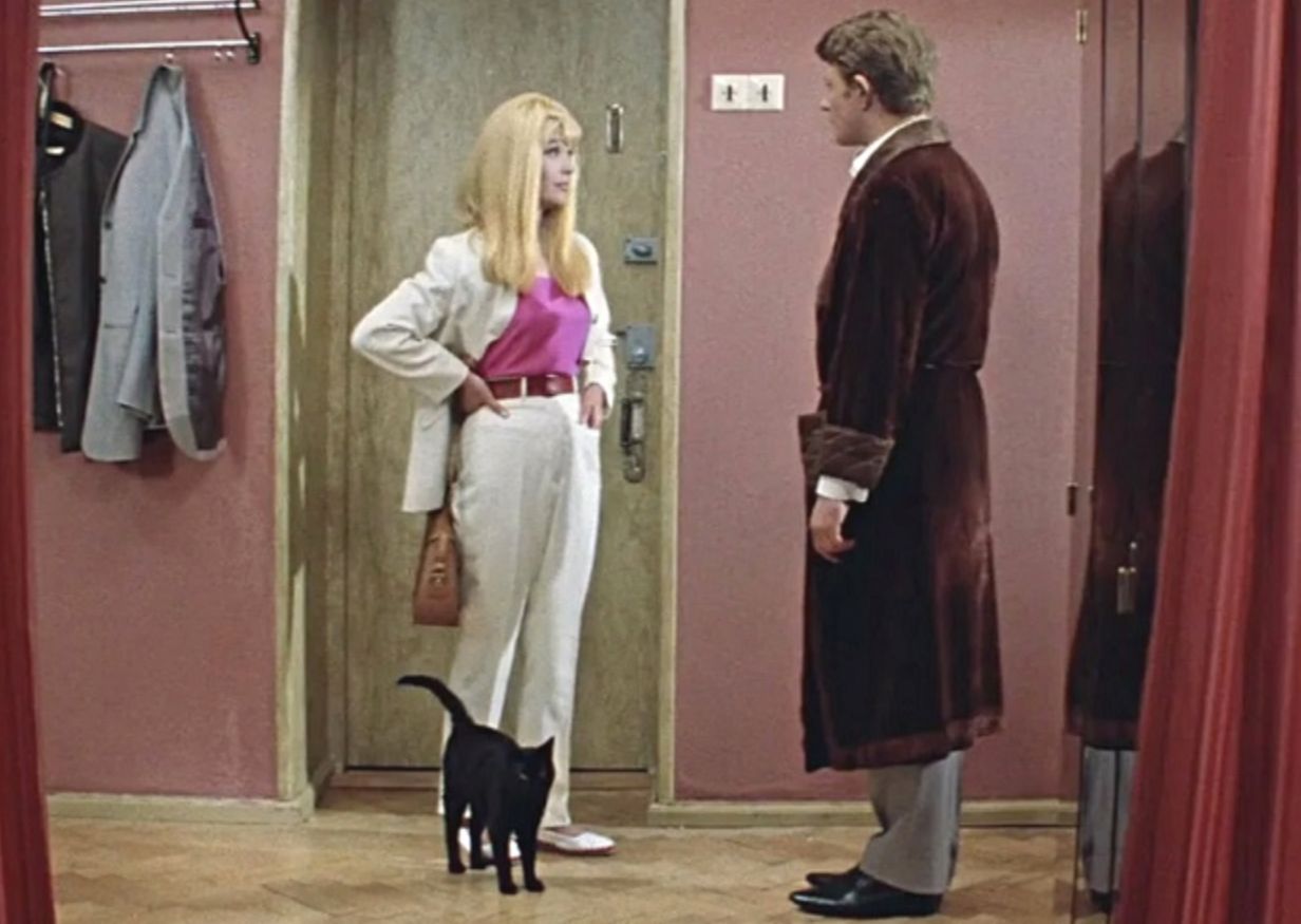 Неудивительно, что у искушенного Геши «снесло крышу» от эффектной красотки в белом брючном костюме, появившейся у него на пороге и заговорившей на блатном жаргоне – «ксива», «хаза»… Кстати, здесь Гайдай использовал явную отсылку к «девушке Бонда» — в фильме про агента 007 она фигурирует в похожем костюме.