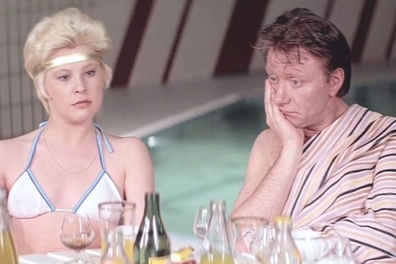 4. А вот финал комедии «Блондинка за углом» (1984) мне не нравится потому, что он …лишний. Эффектной концовкой был бы решительный побег Николеньки Порываева со свадьбы, где все гости – «нужные люди» и всё чуждо, …как и сама невеста. Я не верю, что эта королева гастронома поехала бы за мужем на Крайний Север – она слишком долго пробивалась к материальному достатку. Это – её триумф.
