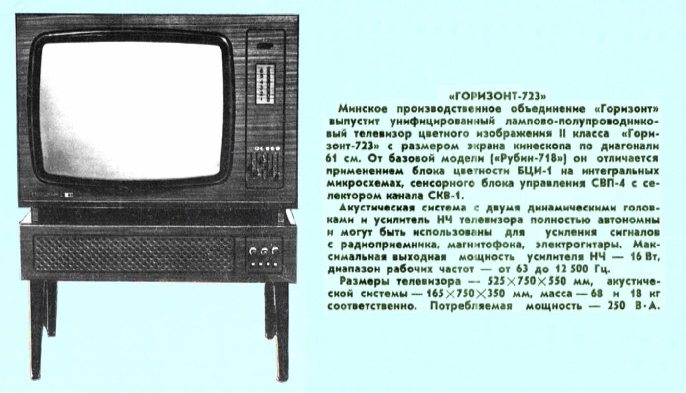 А вот телевизор у Катерины новый, дорогой. Это полупроводниковый-полуламповый цветной «Горизонт-723». Его фишечка — акустическая система под самим телевизором:
