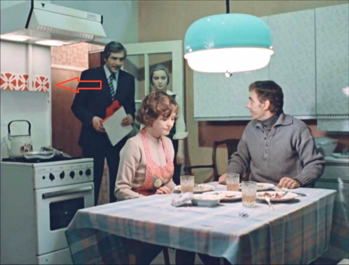 Это дорогущий чешский кафель. У моей соседки был точно такой же. Доставала она его в 1987 году по очень большому блату и за очень большие деньги. Зато потом было чем похвастаться перед соседями. Над плитой мы видим крутую по тем (да и по этим) временам вытяжку с подсветкой. А вот чайник на плите самый обычный эмалированный, какой имелся в каждой советской семье.