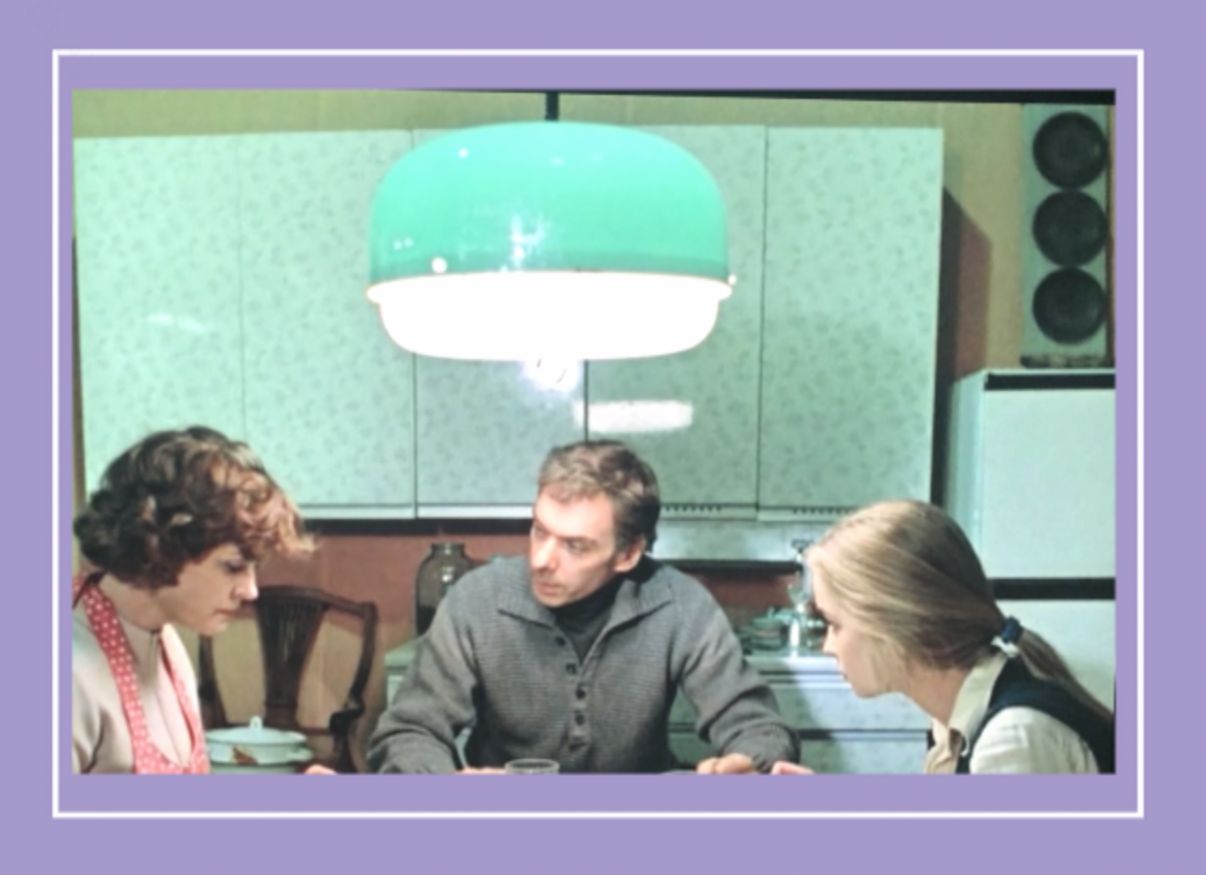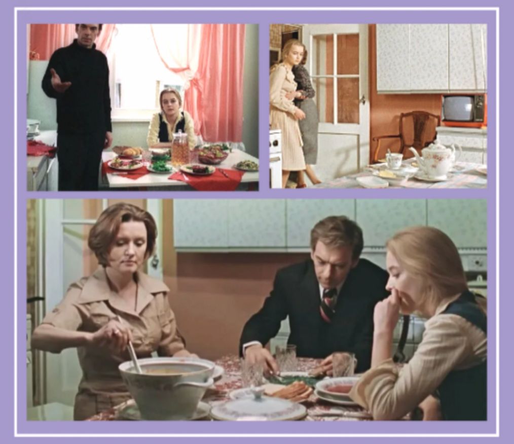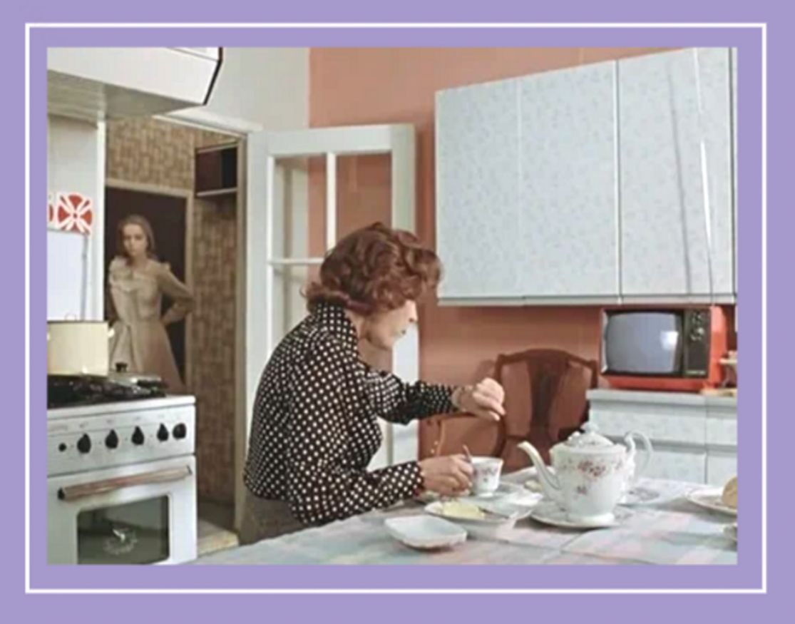Переносной алый телевизор на кухне с антенной для самого потолка — лично для меня в 70-х это была «тихая роскошь». И хотя у Катерины мы видим не самую элитную модель — «Юность». Но мне о таком в то время только мечтать можно было — просто так в нашем магазине «Электроника» эту самую «Юность» было не достать. Да и тратить на эту крошку денег было жалко, ведь вместо нее можно было купить другие более важные вещи.