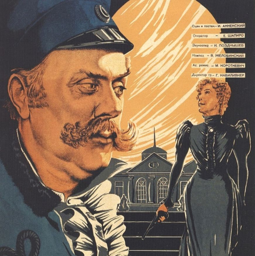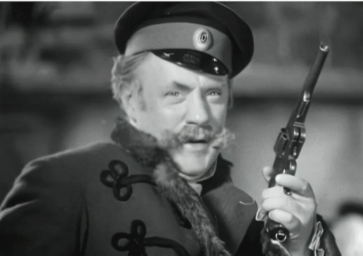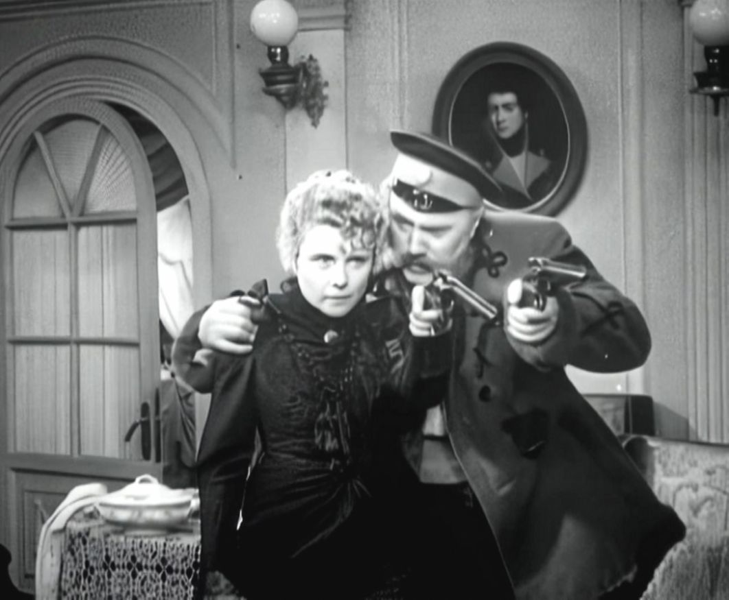 Понятно, что речь зашла о «Медведе» (1938) – фильме Исидора Анненского по коротенькому произведению Антона Чехова, названного самим автором «шуткой». По факту же это короткий водевиль – в одно действие. Анненский немного расширил повествование – он явил помещика Смирнова в его логове. Отставной артиллерист, он забавляется тем, что стреляет по статуэткам и посуде, напевая фривольную песенку.