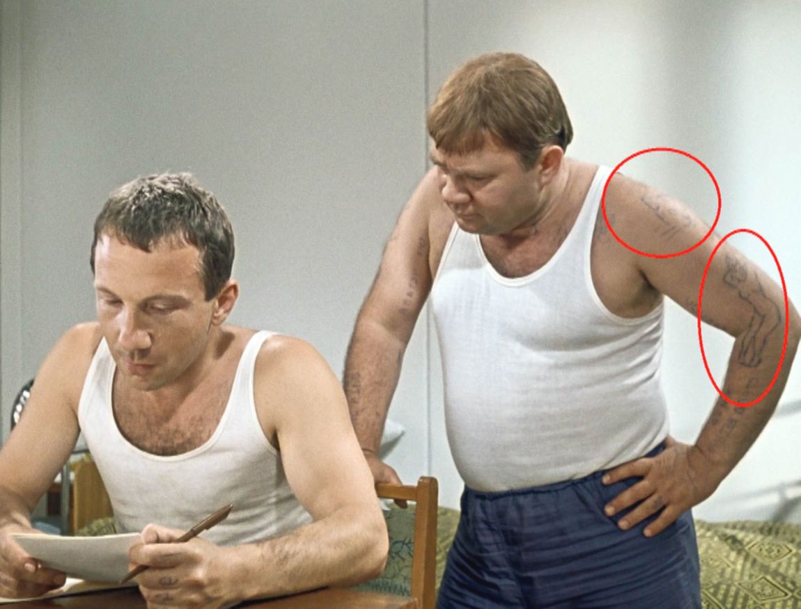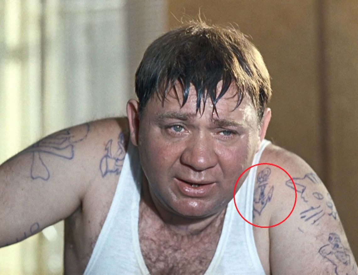 Вообще, татуировки в советском кино играют особую роль. Например, актёр Вячеслав Тихонов в юности сделал татуировку на руке с именем Слава. И поэтому во время съемок её приходилось всячески прятать.