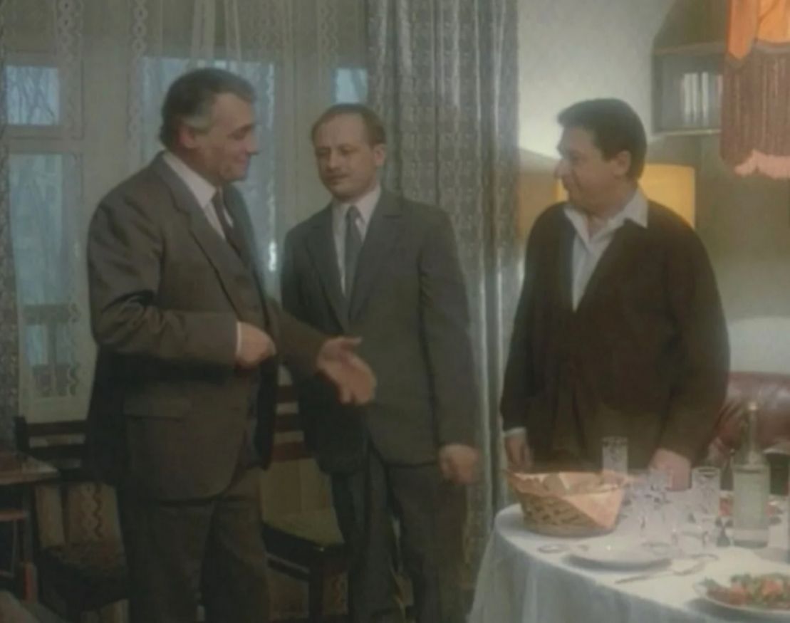 Они сидят за одним столом, пьют вино и ведут светские беседы, хотя когда-то их жизни разошлись навсегда. Это удивительное свойство советского интеллигентного быта — сохранять человеческое лицо даже там, где все давно разрушено.