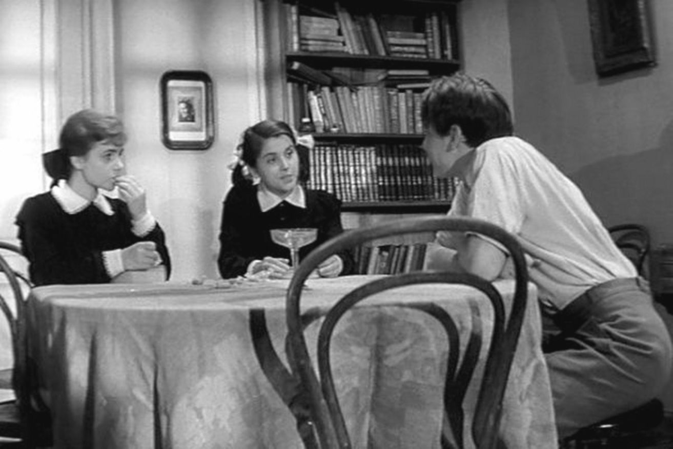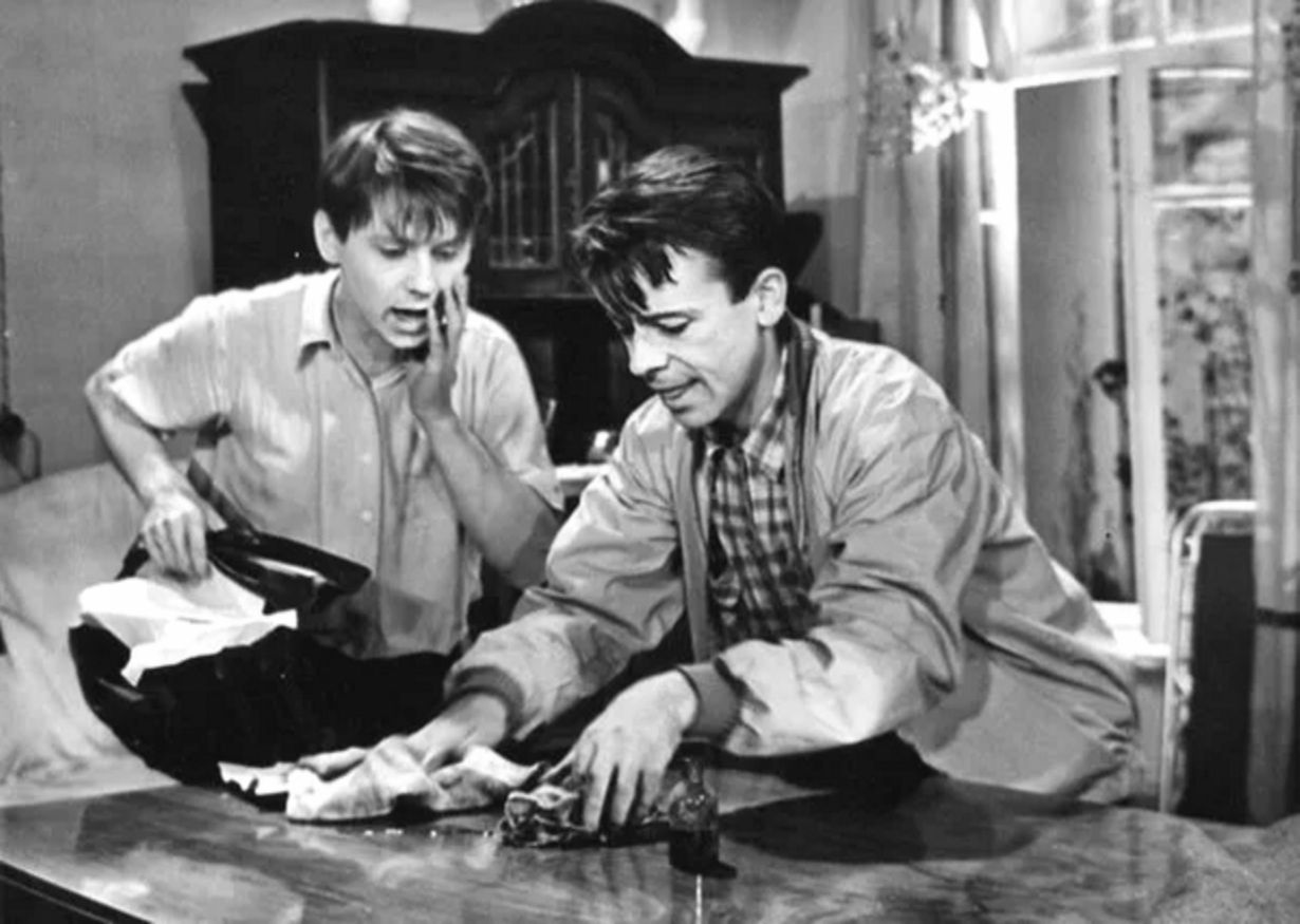 Фильм чёрно-белый, еще той поры мирового кинематографа, когда 20-летних персонажей играли 35-летние артисты. Вот, например, Олег Табаков, которого вы можете наблюдать на фотографии выше. Ещё худой и стройный, на себя мало похож, но всё же ему тут 25 лет и на 15-летнего подростка никак не тянет, от чего его старания изобразить мальчишку выглядят натянутыми, и местами он заметно переигрывает.