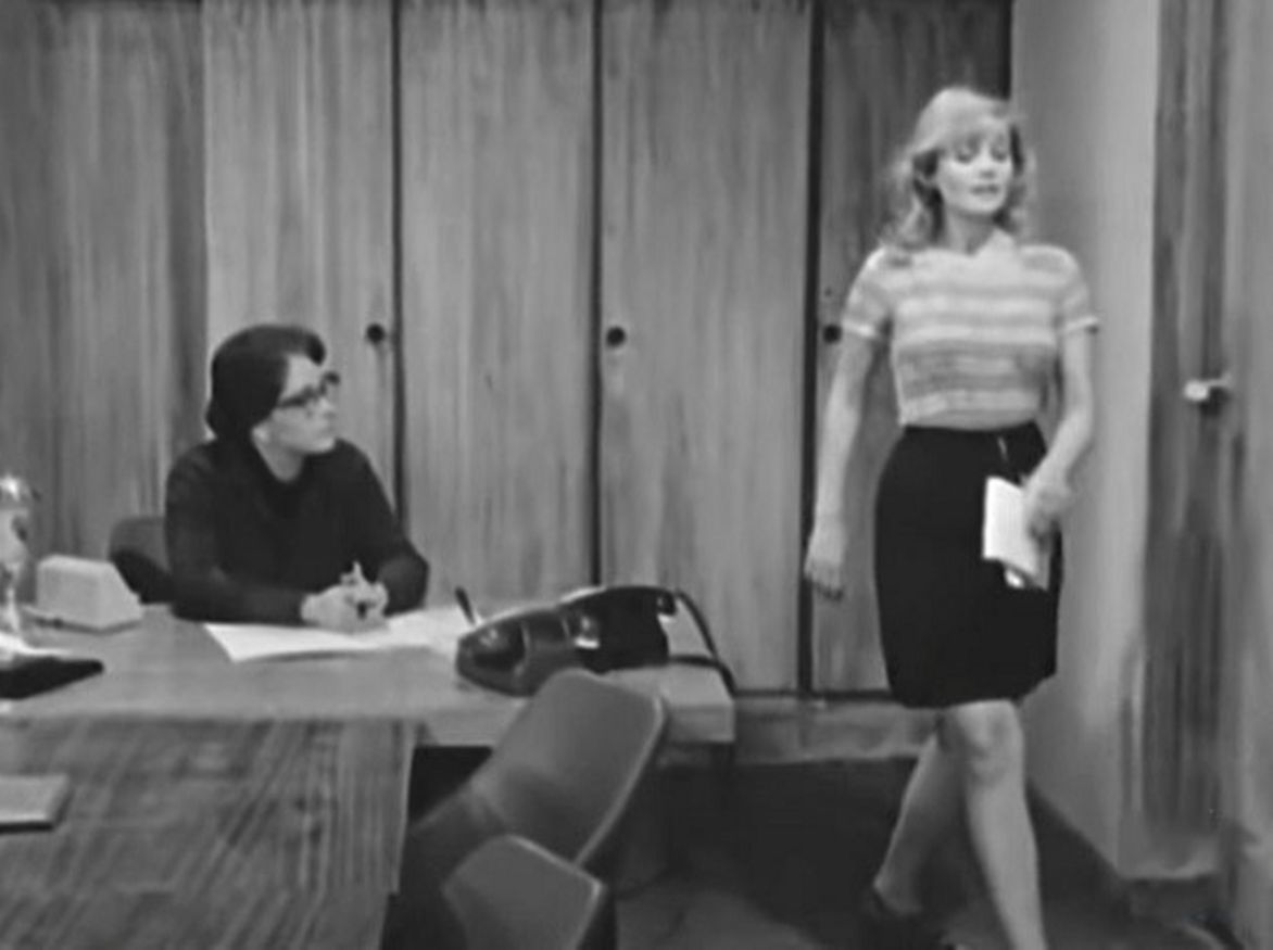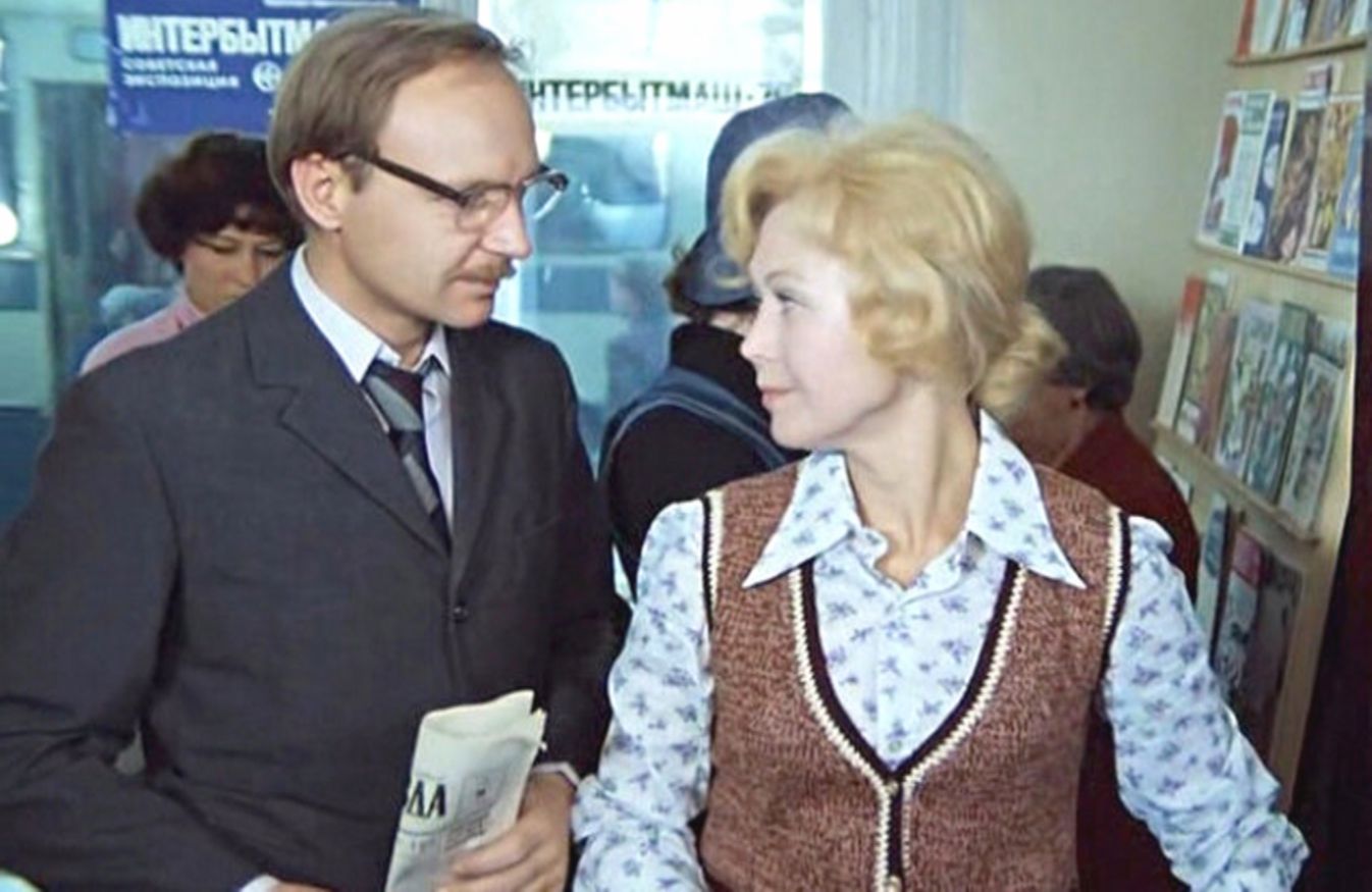 Однако в фильме эта сцена показана совсем по-другому. Новосельцев встречается с Ольгой в фойе здания. Никакой Верочки и рядом нет, а до разгоны от Мымры еще далеко. Новосельцев обращается конкретно к Ольге. И помните, как на его намёк Оленька Рыжова сделала стеклянные глаза и с демонстративным равнодушием ответила «Не знаю».