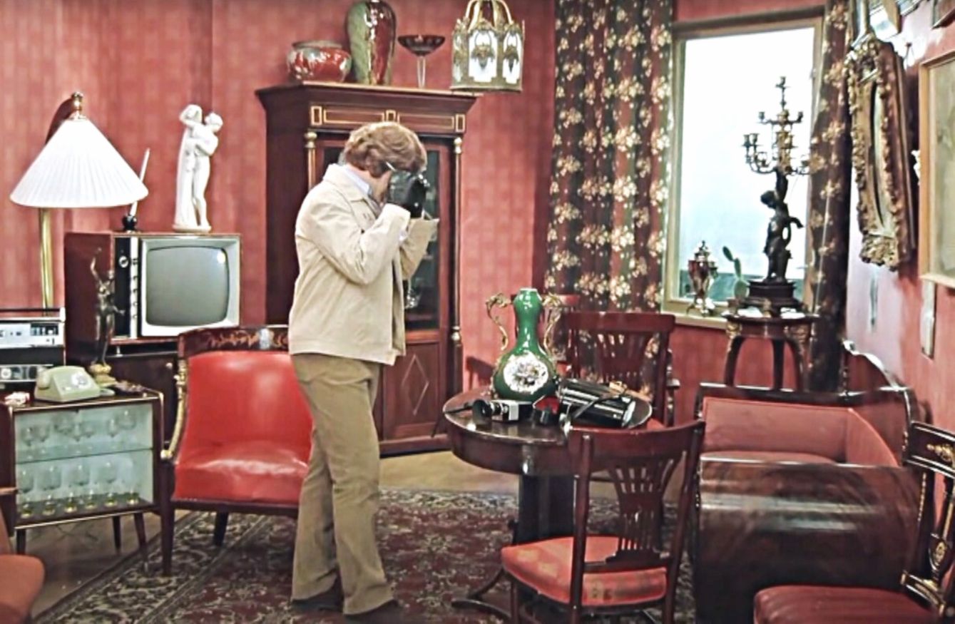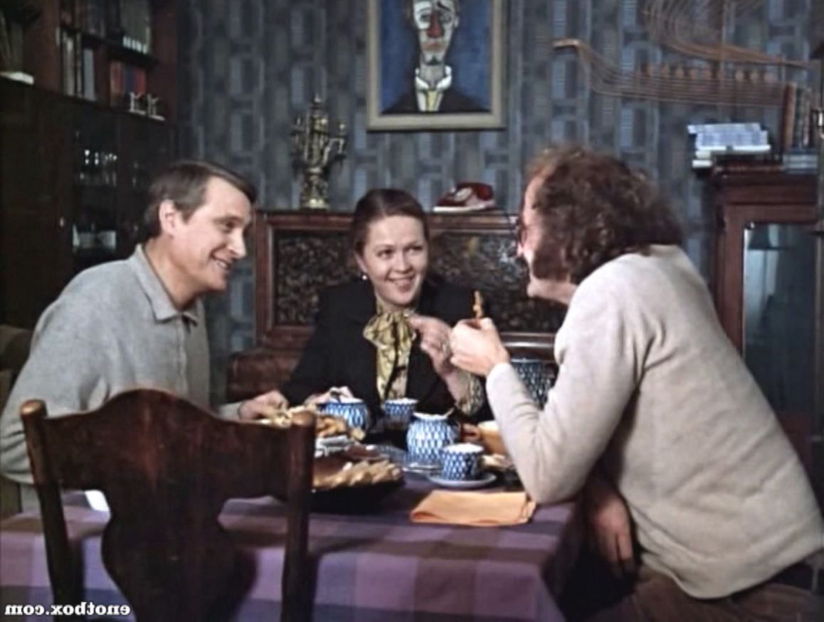4. Интересной мне представляется ленинградская квартира переводчика Андрея Бузыкина из не менее грустной комедии «Осенний марафон» (1979). Сразу видно, что это – старинная мебель, доставшаяся Андрюше от интеллигентных предков. Этакий осколок дореволюционной питерской роскоши. Славист Билл Хансен попал в нужное место!