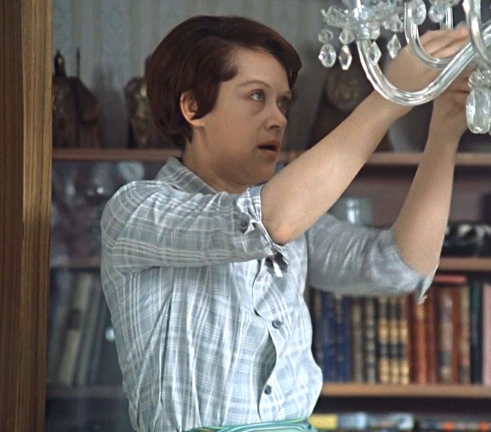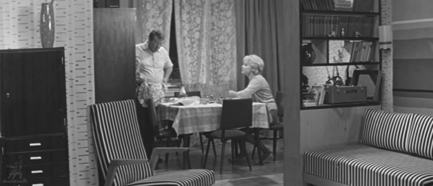 Квартира Лидии Сергеевны, которую сыграла Ирина Скобцева – модерновая хата, как тогда говорили (не путать со стилем Модерн). Особенно показательна перегородка-стеллаж – она служила не только хранилищем книг, вазочек и статуэток, но и барьером, делящим помещение на отсеки.