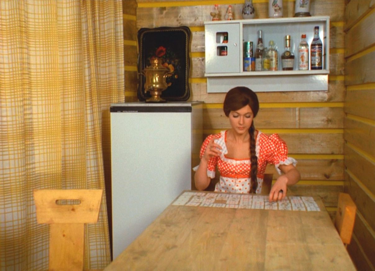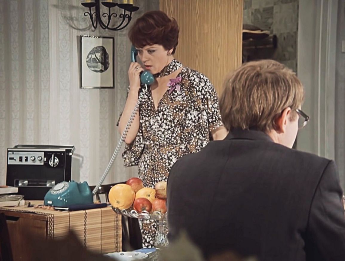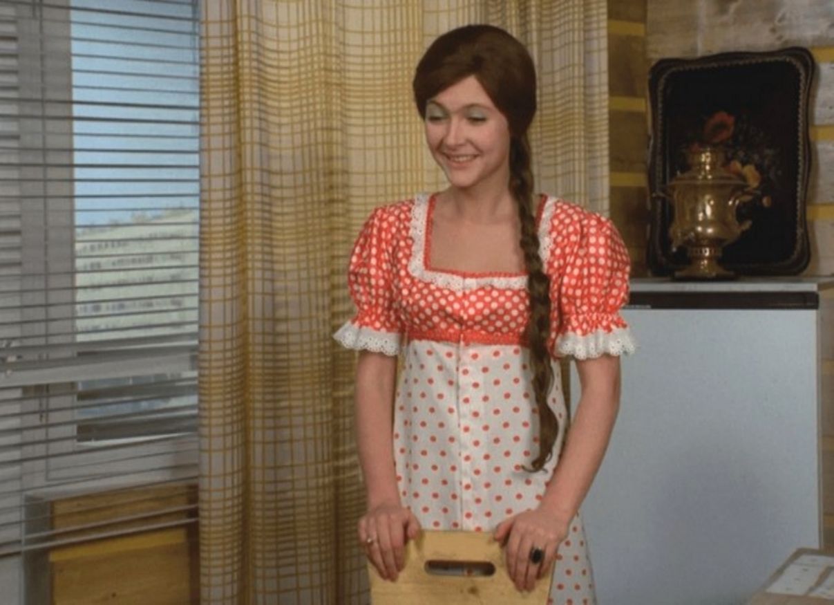 3. А это – яркая противоположность геометризму и простоте. Квартира Леночки Орловой из печальной комедии «Афоня» (1975) режиссёра Георгия Данелии! Всё оформлено в этническом духе – жостовский поднос, вышитые рушники, дымковская игрушка, самовар, мезенская роспись, да и сама женщина одета в рустикальном стиле.