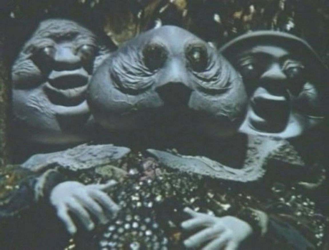 2. Далее – ещё одна экранизация. Это — «Разлучённые» (1980) по сказке Юрия Олеши «Три толстяка» (1980). Нечто тёмное, странное, инфернальное – особенно сами Толстяки. Впоследствии такие же дивные лица были у космических пиратов из «Гостьи…». Что-то инопланетное, выползающее из тьмы.