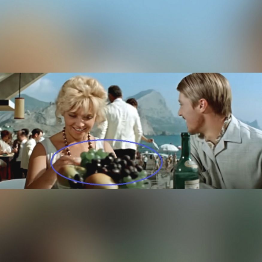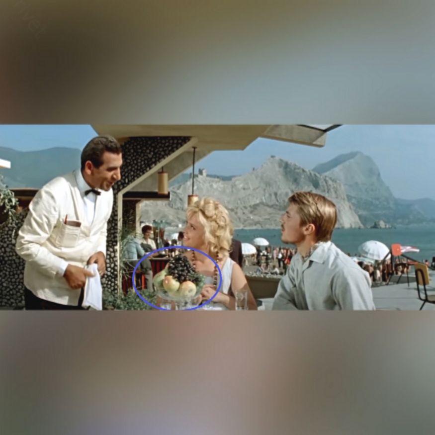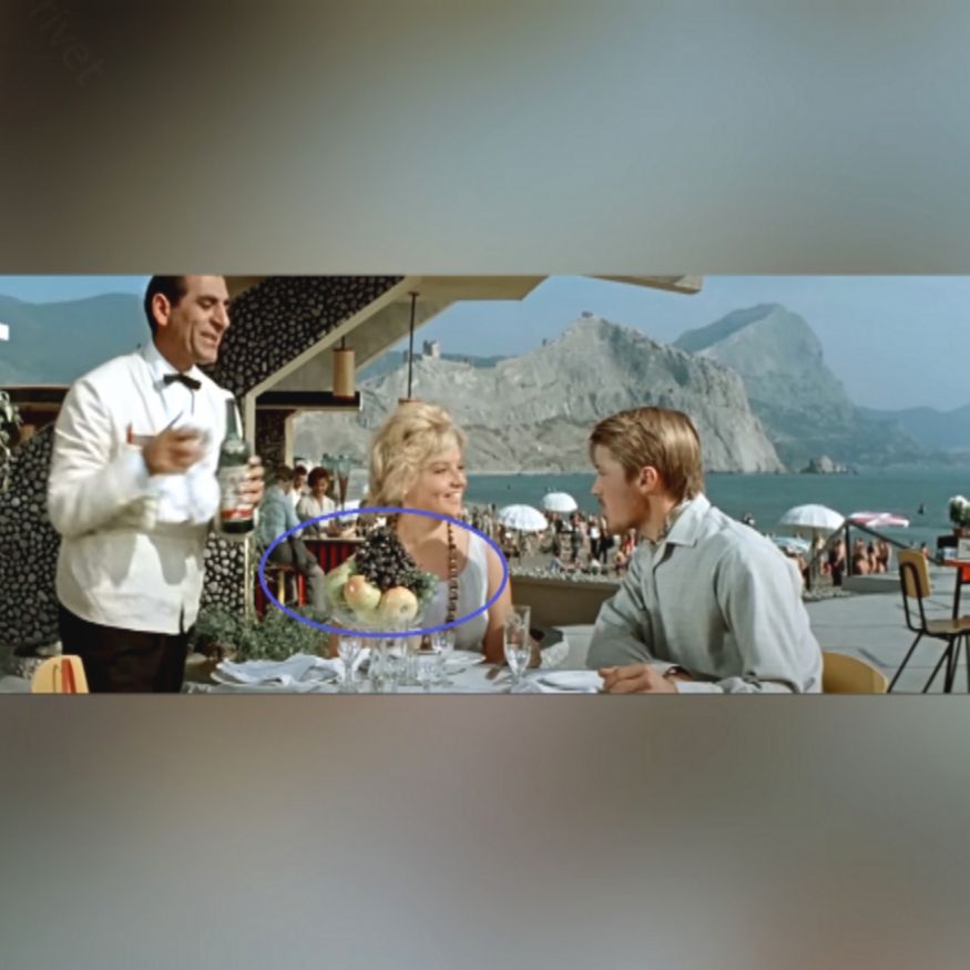 На 55-й минуте фильма Вадим и Наташа приходят в ресторан, где их ждет уже сервированный стол. В центре стола стоит ваза с фруктами, создавая атмосферу уюта и комфорта.