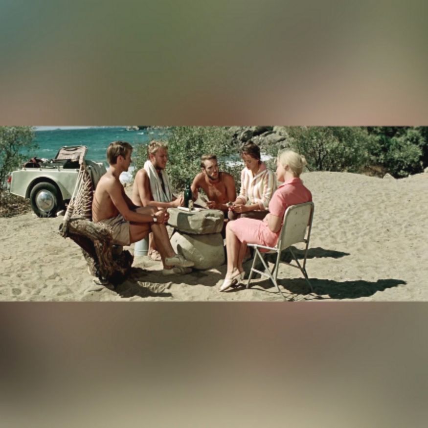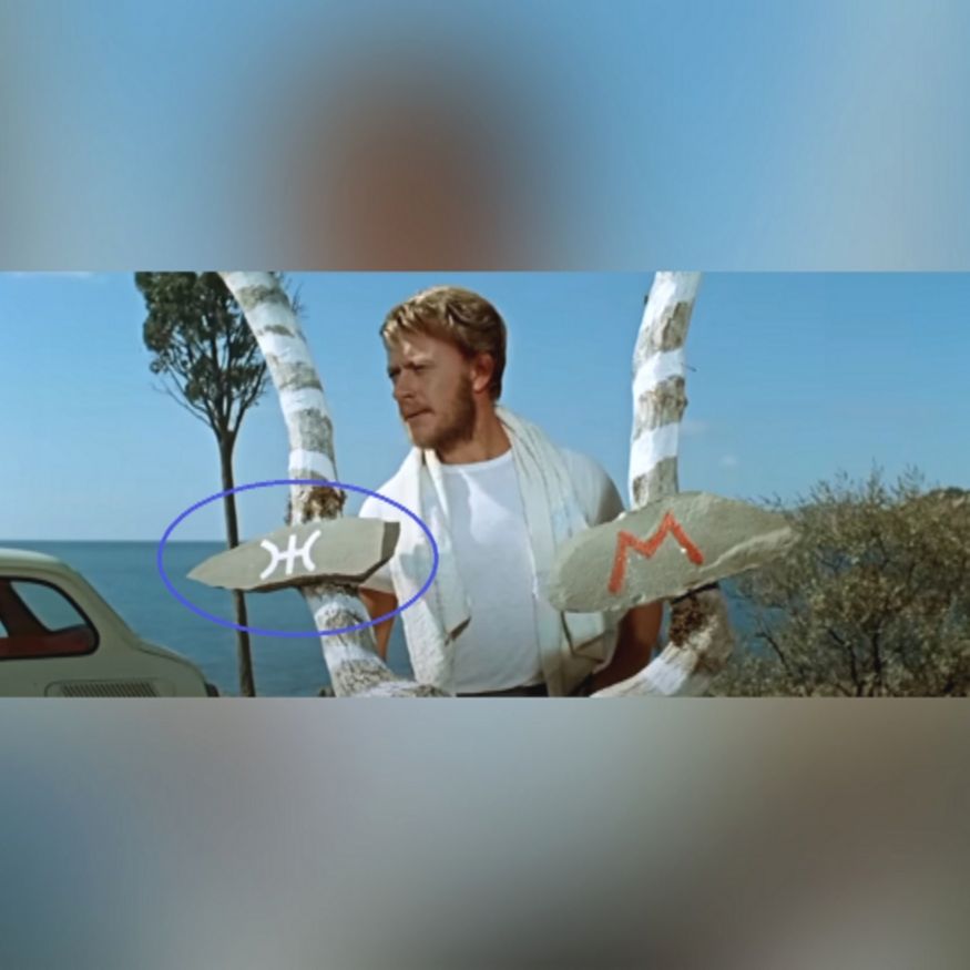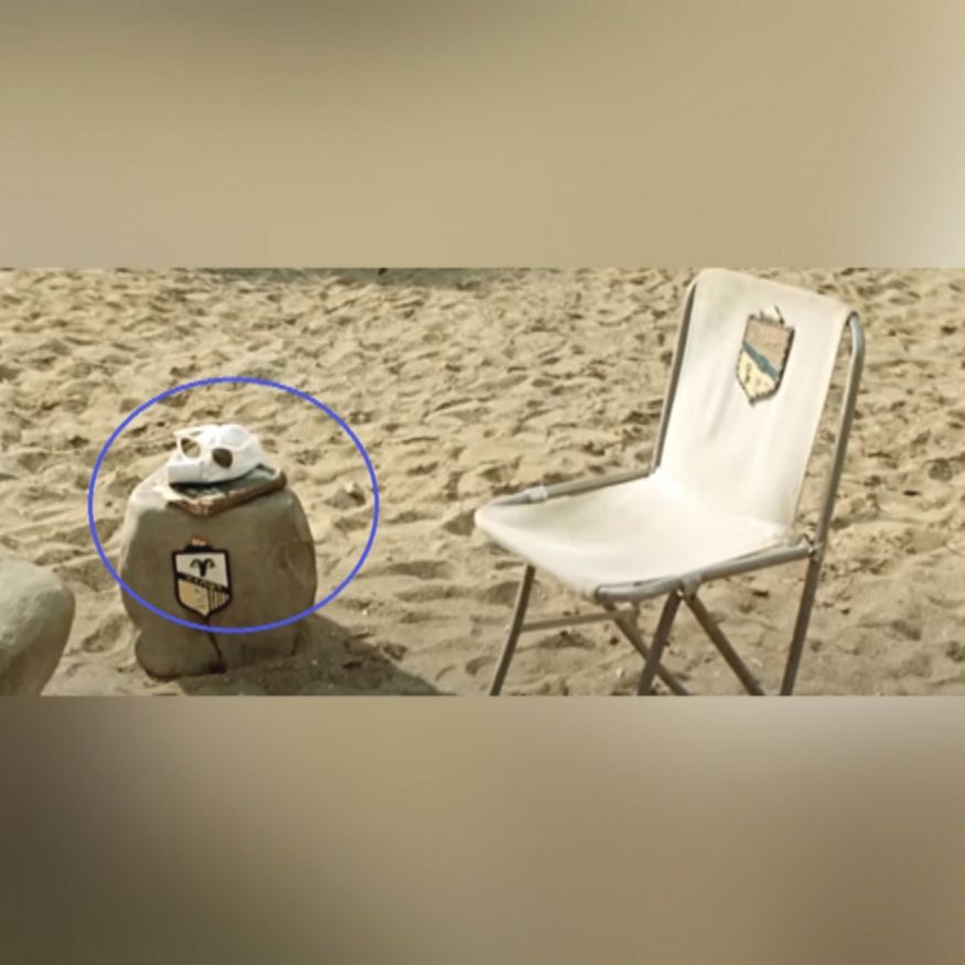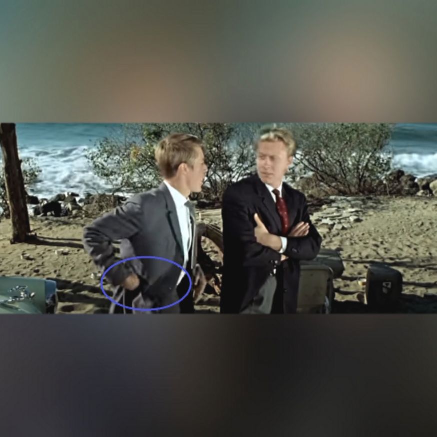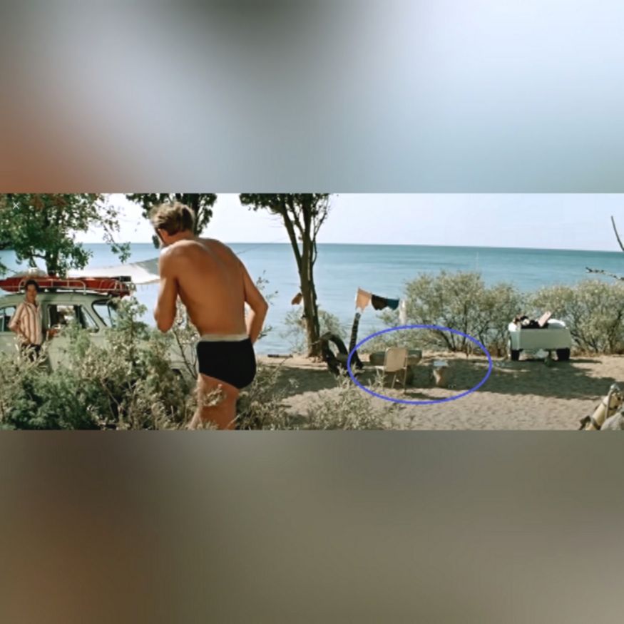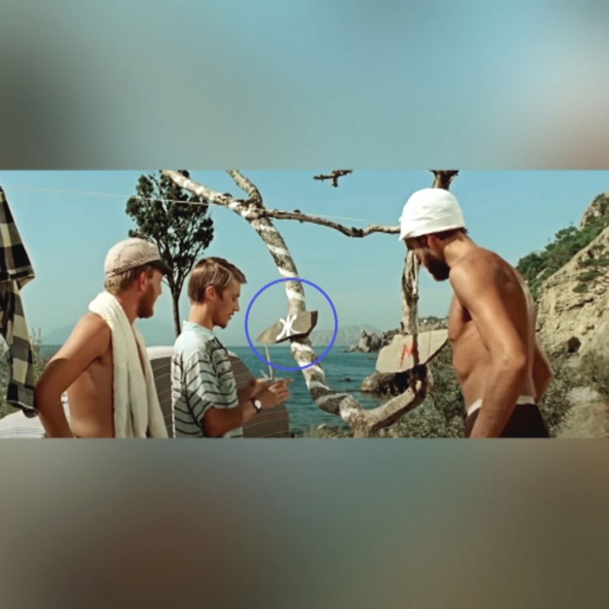 Затем ракурс камеры меняется, и мы видим, как Зоя решает нажать на сигнал автомобиля, чтобы привлечь внимание своего спутника. В этот момент камера показывает общий план, и оказывается, что очки уже лежат на песке, а стул, на котором сидел герой, немного сместился в сторону.