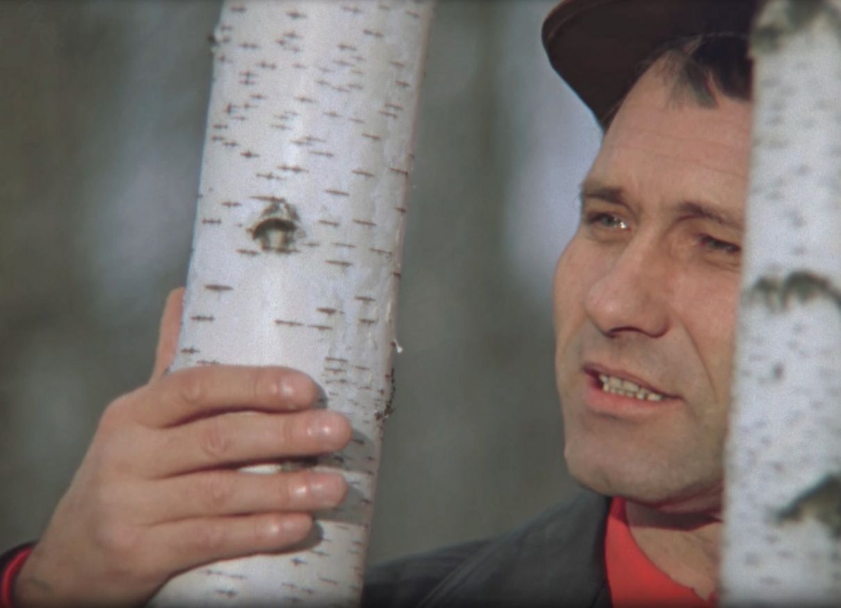 В тишине березовой рощи человек в красной рубахе прижимается щекой к стволу и разговаривает с деревом, как со старой знакомой. Просто, без пафоса, негромко.