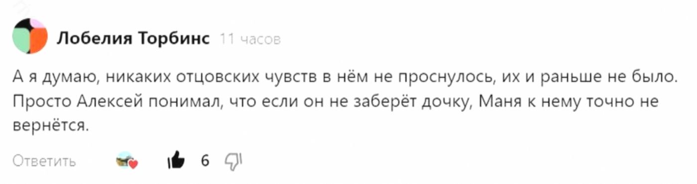 И мне представляется, что порыв Алексея все-таки был искренним. Он был совсем неплохим человеком и скучал по Люсе. Неужели вы согласны, что Леша поехал к Руфине в город и забрал дочь только чтобы вернуть Маняшу, а на ребенка ему в общем-то было плевать? Скользкий момент. Что думаете?